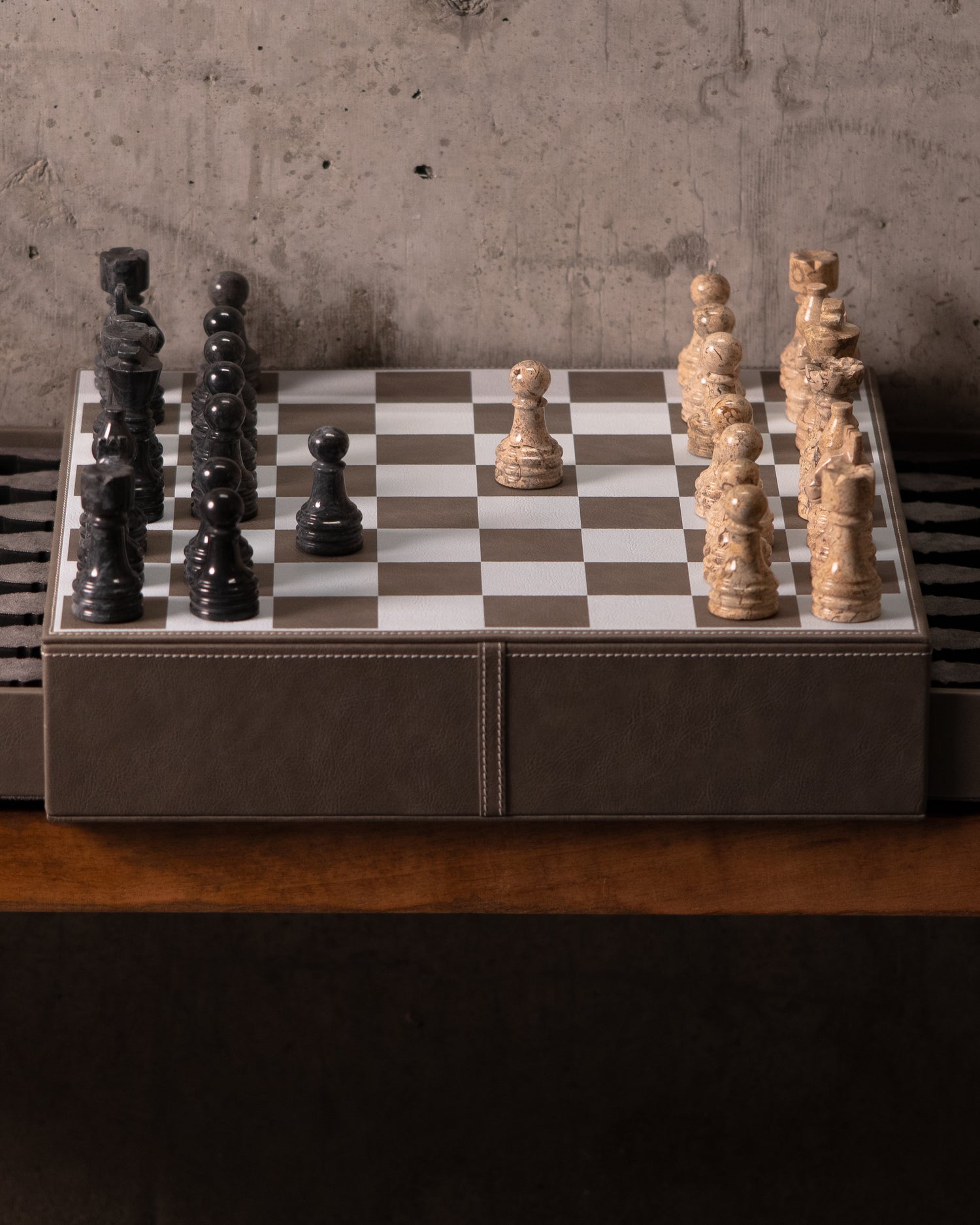 Exquisite luxury Chess set handcrafted from premium vegan leather. Featuring a tactile grid and weighty pieces, this modern classic belongs in the study or the salon, speaking volumes without words.