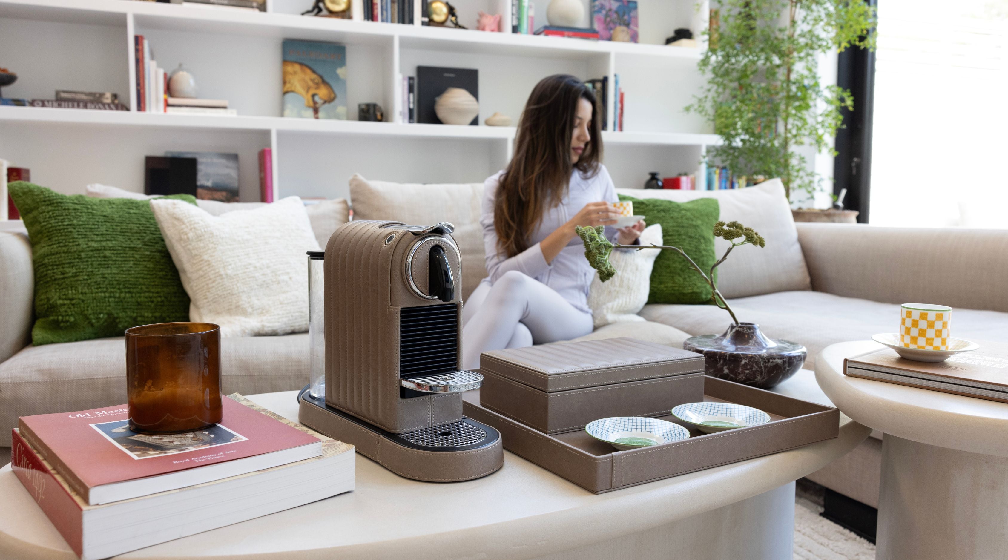 This bundle is for the espresso lover. Enjoy the Nespresso Citiz coffee maker cladded in your color choice of vegan leather. This bundle brings you a beautiful setting for your coffee machine and elevates your space with a touch of elegance and luxury.