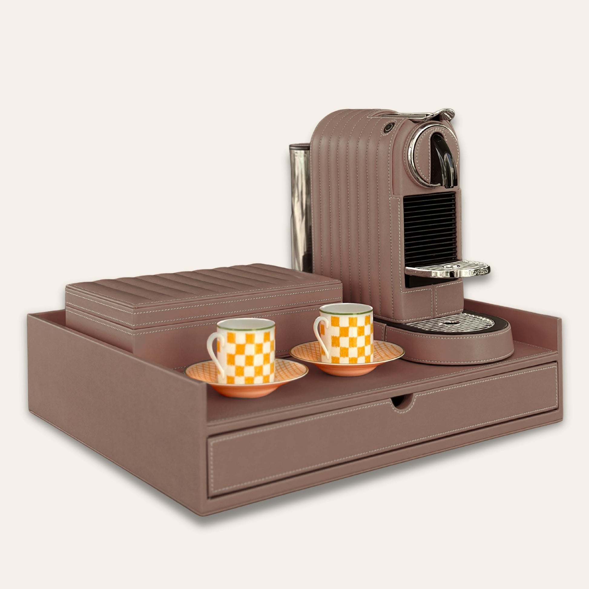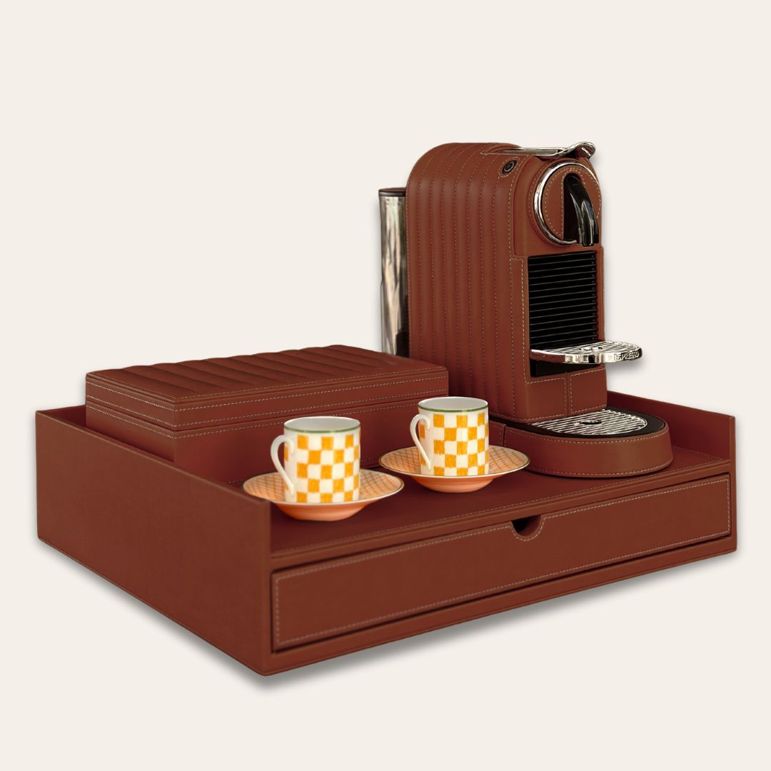 This bundle is for the espresso lover. Enjoy the Nespresso Citiz coffee maker in your color choice of vegan leather. This bundle brings you a beautiful setting for your coffee machine and elevates your space with a touch of elegance and luxury.