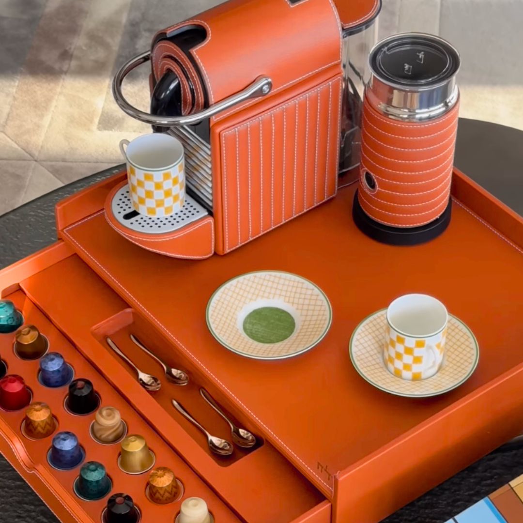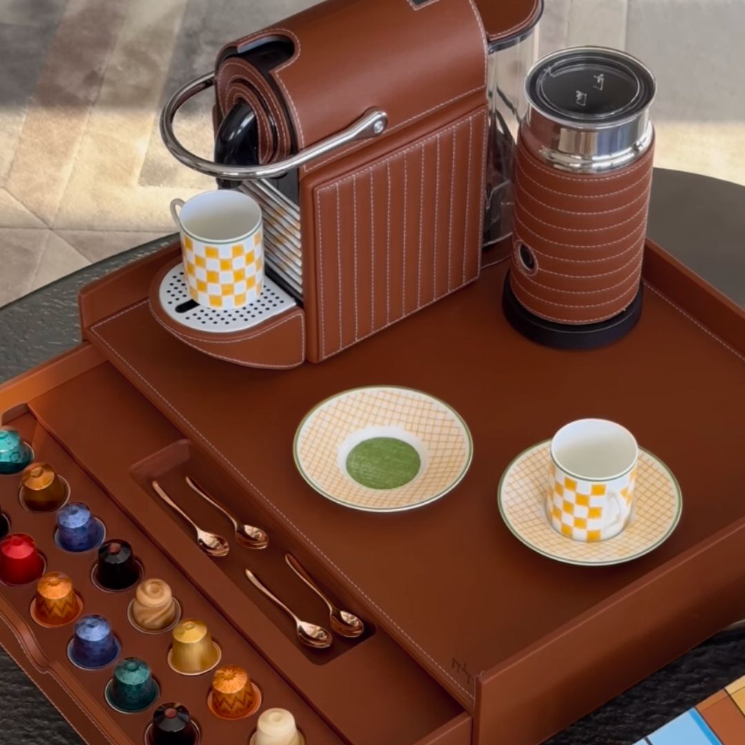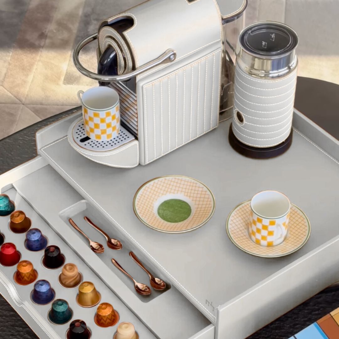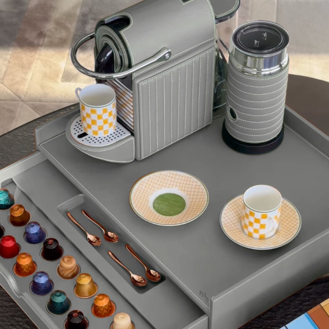 Combining our signature tray with drawer for coffee capsule storage with the Nespresso Pixie Coffee Machine and Milk Frother, all cladded in a sustainable high-quality vegan leather.